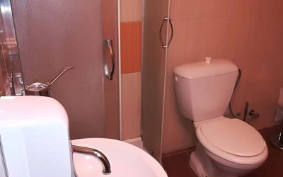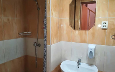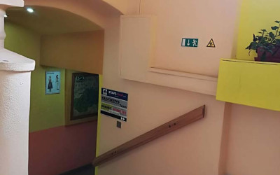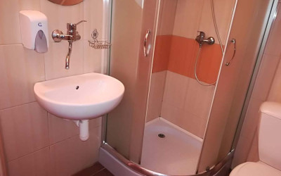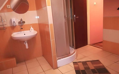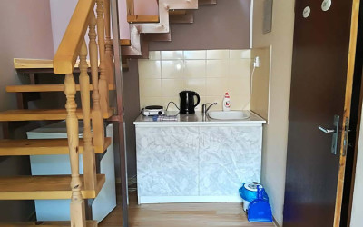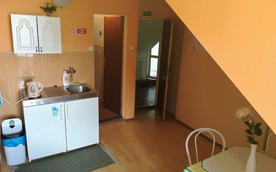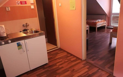 Vstup do apartmánu 3 je cez vchod ubytovne. Skladá sa z dvoch častí. Prvá vstupná časť je na prízemí. Je to obývacia časť spojená s malou kuchynkou. Má malú chladničku, kanvicu a jednoduchý riad na prípravu kávy alebo čaju. V prípade hladu navštívite Bagetériu alebo Slovenskú reštauráciu, ktoré sa nachádzajú v objekte. Z tejto miestnosti je veľké okno do dvora. Zo vstupnej obývacej časti je vchod na WC a sprchu. Do spacej časti apartmánu sa dostanete po drevených schodoch, preto tento apartmán neodporúčame imobilným hosťom.