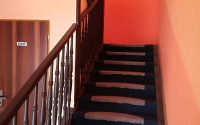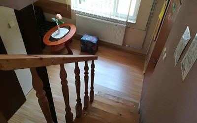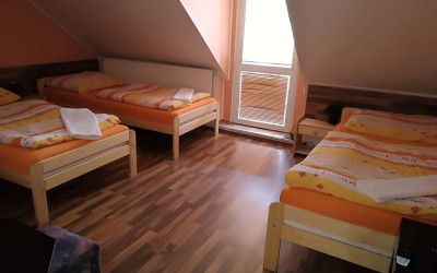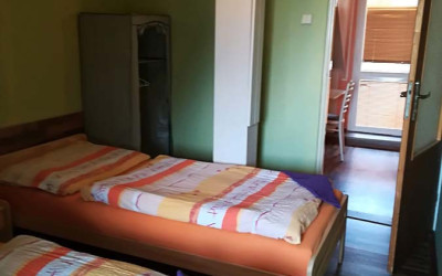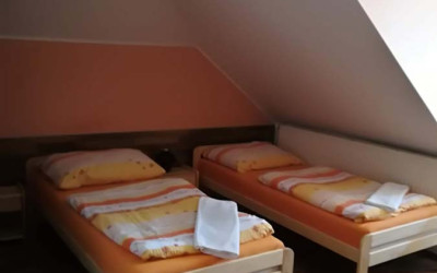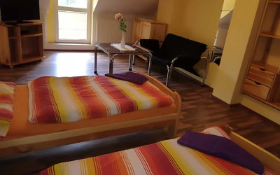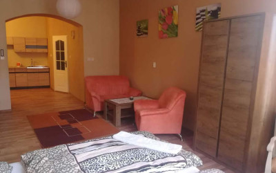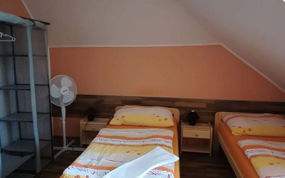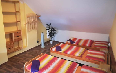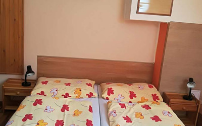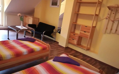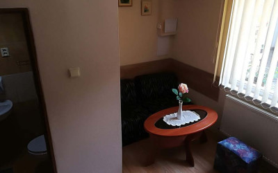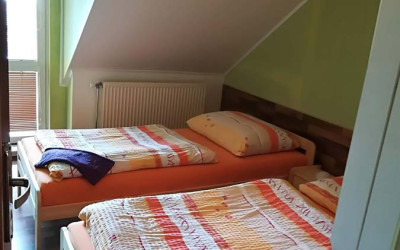 Apartmán 2 na poschodí. Na tomto poschodí sú len dva apartmány. Tento apartmán je rodinný so vstupnou časťou, 2 izbami a toaletou. Vo vstupnej časti je veľký rodinný stôl, a jednoduchá kuchynka s el. varičom, chladničkou a kanvicou. V objekte nachádza Slovenská reštaurácia a Bagetéria a tak kuchynka nie je vybavená na zložité varenie jedál, len na prihriatie, resp. prípravu raňajok. Odtiaľ je vstup do kúpeľne vybavenej sprchovacím kútom, umývadlom a WC. V prvej izbe sú tri samostatné lôžka a TV, v druhej izbe sú dve lôžka. Postele sú pripravené na spanie, k dispozícii sú uteráky. Matrace sú nové a pohodlné. V apartmáne je wifi. Hostia majú kľúče od vchodu a apartmánu, brány a vstup si odomykajú elektronicky. Apartmán má dva spálne orientované na východ, obe majú malé balkóny na šírku dverí orientované do záhrady a tým sú príjemne tiché na spánok a právom ho považujeme za najtichší apartmán v centre mesta. Vstupná kuchynská časť má balkón orientovaný do dvora, na západ. Parkovanie vo dvore s kamerami je zdarma.