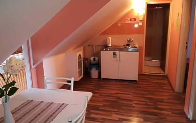 Apartmán 4 sa nachádza v hlavnej budove v centre mesta. Je na poschodí v murovanej časti domu, čo vytvára príjemnú klímu v zime aj v lete. Je to náš luxusný apartmán, nakoľko je nový, s veľkorysým priestorom. Pri vstupe je kuchynka, s okrúhlym stolom.