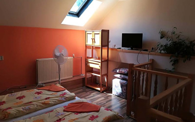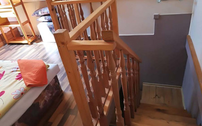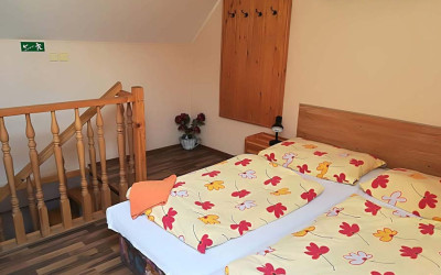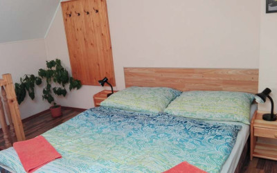 Na poschodí sú dve postlané spojené postele s uterákmi, je tu TV. Okno je strešné so žalúziou. V apartmáne je wifi. Hostia majú kľúče od vchodu a apartmánu, brány a vstup si odomykajú elektronicky. Parkovanie vo dvore s kamerami je zdarma.